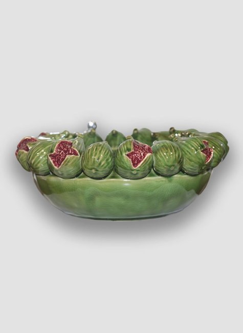 Celebre a beleza da natureza com este magnífico centro de mesa em cerâmica esmaltada. Uma peça que transborda charme e sofisticação, cuidadosamente moldada para se tornar o ponto focal de qualquer ambiente. A base, em um vibrante tom de verde, é coroada por uma guirlanda de figos em relevo, alguns inteiros e outros revelando sua polpa vermelha e suculenta.