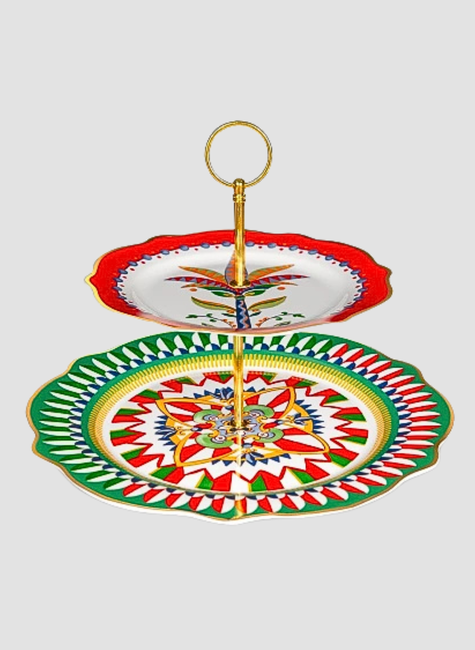 Prato de dois andares em porcelana, composto por um elegante suporte em metal com acabamento dourado que confere imponência e sofisticação à peça. A estrutura vertical valoriza a apresentação e transforma o conjunto em um verdadeiro destaque à mesa. A combinação das cores e dos padrões remete às tradicionais cerâmicas artesanais do sul da Itália, onde a arte e a mesa caminham juntas como expressão cultural.
