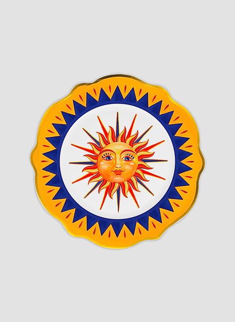 Prato decorativo em porcelana com design impactante e cheio de personalidade. A borda ondulada em amarelo vibrante, combinada com detalhes geométricos em azul profundo, cria um contraste elegante e marcante. No centro, o sol estilizado com expressão delicada e traços artísticos em tons quentes de laranja e vermelho se destaca como protagonista da composição, irradiando energia e charme.