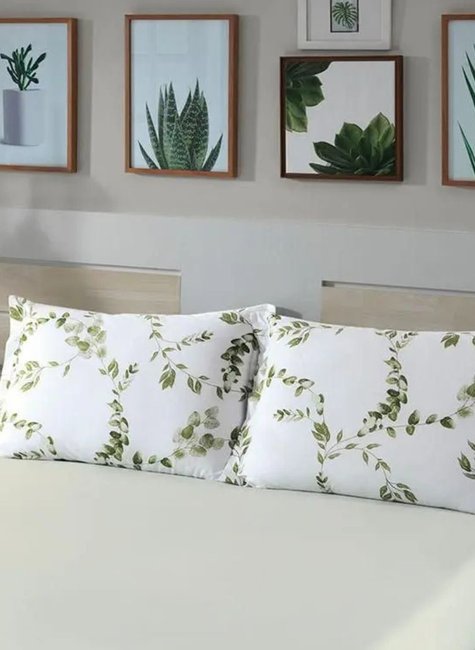 As fronhas possuem estampa corrida e 2 abas laterais. O lençol de baixo é com elástico e de cor sólida. 90 g/m²