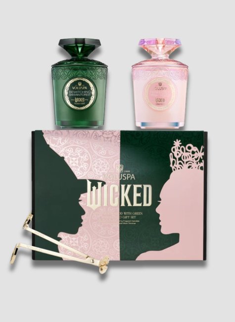 Descubra o conto aromático de dois opostos que se atraem. Com a Vela Yuzu Perfeitamente Rosa de Glinda e a Vela Floresta de Figueira-de-Bengala Feiticeira de Elphaba. Este conjunto inclui duas velas de 8.5 oz (aproximadamente 240g) embaladas em uma caixa extravagantemente decorada, completa com um aparador de pavio banhado a ouro.