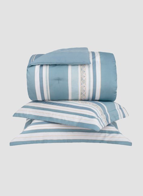 O kit colcha matelassado, destaca-se pelo mix de elementos decorativos em tons azuis, com vivacidade e requinte ímpar