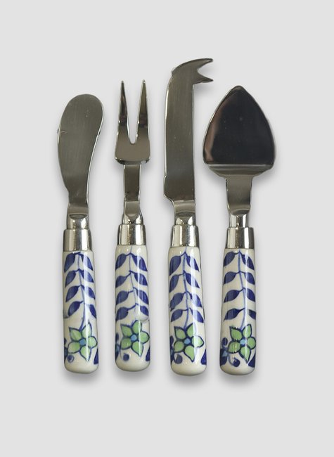 As lâminas são produzidas em aço inoxidável de alta qualidade, assegurando resistência e durabilidade, enquanto os cabos em porcelana trazem delicados desenhos em azul e verde, inspirados em motivos florais, que adicionam charme artesanal e sofisticação à peça.