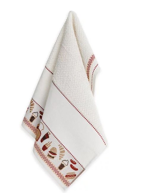 O pano de prato atoalhado da Karsten possui uma ótima qualidade, toque macio e possui barrado jacquard estampado.