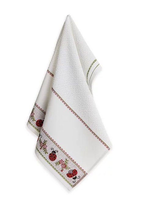 O pano de prato atoalhado da Karsten possui uma ótima qualidade, toque macio e possui barrado jacquard estampado.