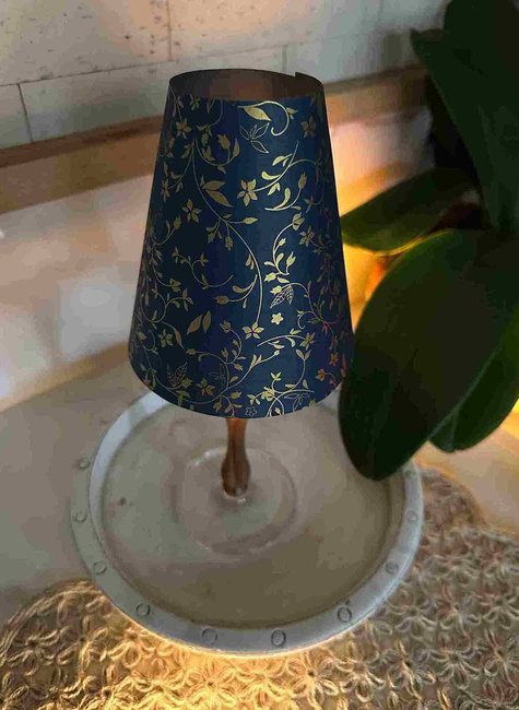 Produto artesanal com design exclusivo produzida em papel 180g/m2 estampado manualmente. Apresenta motivo floral dourado sobre fundo azul marinho e interior azul marinho.