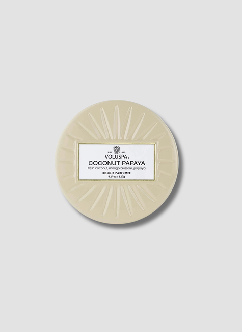 A exclusiva mistura de cera de coco da Voluspa é apresentada em um recipiente metálico, adornado com estampa e finalizado com uma tampa combinando, que mantém a vela protegida da poeira quando não está em uso.