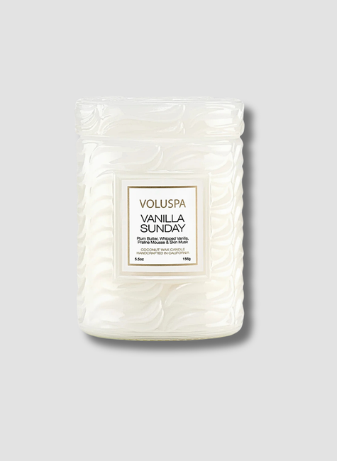 A exclusiva mistura de cera de coco da Voluspa é apresentada em um elegante recipiente de vidro branco com relevo em espiral, finalizado com uma tampa de vidro igualmente trabalhada.