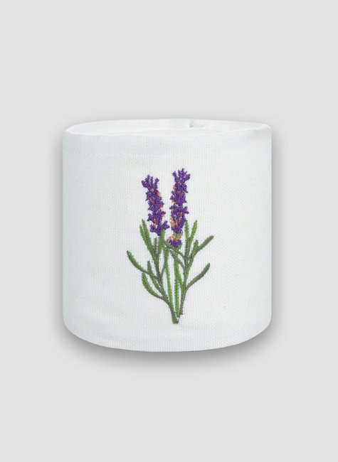 Porta Papel Higiênico para lavabo em tecido linhão com fechamento em velcro, com bordado de lavanda.