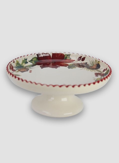 O Prato de Bolo Decorativo Poinsettia é confeccionado em cerâmica faiança, uma técnica artesanal secular.