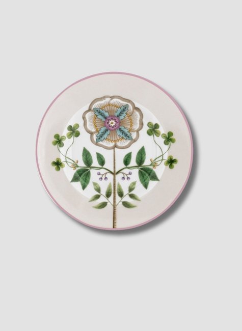 Além das decorações botânicas, vários itens também são decorados com uma estampa caleidoscópica correspondente, composta por centenas de pequenas flores e folhas. A repetição e os detalhes desta estampa fazem você se sentir como se estivesse olhando através de um prisma. Muitos dos itens são finalizados com uma borda geométrica decorativa extra.