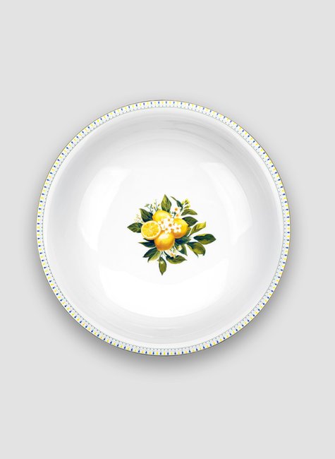 Prato branco com filete em ouro toda borda e aplicação de decalque geométrico, no centro decalque de limão