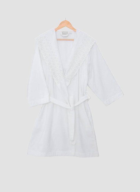 Roupão Crystal é produzido em Fio Penteado com aplicação de renda bordada com veludo na gola. Modelagem feminina com bolsos laterais e cinto.