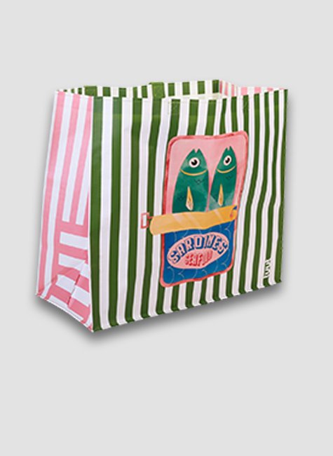 Seu design se destaca pela estampa listrada e pela ilustração divertida de uma latinha de sardinhas, que adiciona um toque de arte e irreverência ao seu look. Uma alternativa prática, ecológica e cheia de charme para substituir as sacolas plásticas.