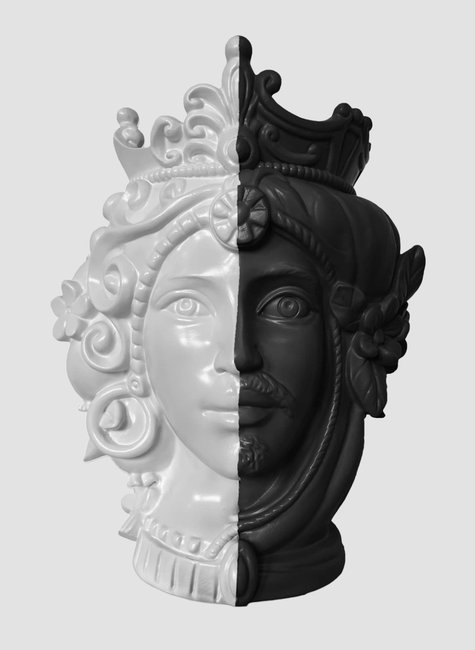 A Estátua Decorativa 'TESTA DI MORO' apresenta um design arrojado, dividindo uma única face em duas metades distintas: uma em branco puro e outra em preto profundo. Esta dicotomia visual não é apenas esteticamente impactante, mas também carrega um simbolismo rico, representando a complexidade da natureza humana, o equilíbrio entre opostos e a interconexão de luz e sombra. Cada detalhe, desde os traços faciais delicados até os adornos intrincados que coroam a figura, é esculpido com precisão, criando uma peça que é ao mesmo tempo clássica e contemporânea. O contraste marcante entre o branco e o preto confere à estátua uma presença dramática, capaz de transformar instantaneamente a atmosfera de qualquer ambiente. Seja em uma sala de estar moderna, um escritório minimalista ou um hall de entrada clássico, a 'Dualidade' se destaca como uma obra de arte que provoca pensamento e admiração. A escolha das cores não é aleatória; o branco simboliza pureza, paz e clareza, enquanto o preto representa mistério, elegância e poder, criando uma harmonia visual que é ao mesmo tempo simples e complexa.