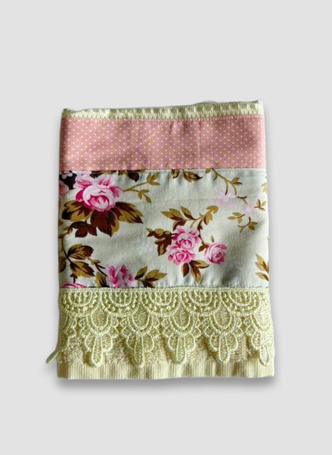 Esta toalha se destaca pela sua estampa alegre e pelos detalhes de acabamento em renda e bordado, que trazem um visual mais caprichado e delicado à peça.