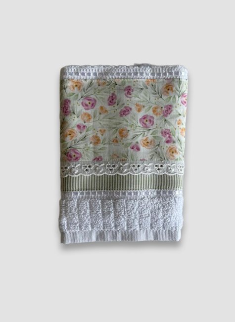 Esta toalha se destaca pela sua estampa alegre e pelos detalhes de acabamento em renda e bordado, que trazem um visual mais caprichado e delicado à peça.