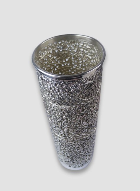 Transforme seu ambiente com elegância e personalidade! Este vaso decorativo prateado é uma verdadeira obra de arte, trazendo um detalhado trabalho em relevo floral que une sofisticação e charme atemporal.