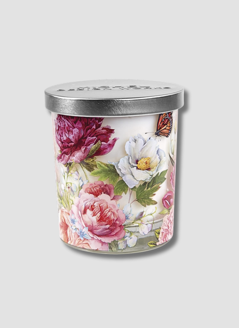 A vela perfumada da Michel Design Works é apresentada em um elegante recipiente de vidro com tampa de metal, trazendo a charmosa estampa da coleção Blush Peony, que adiciona um toque decorativo sofisticado ao ambiente.